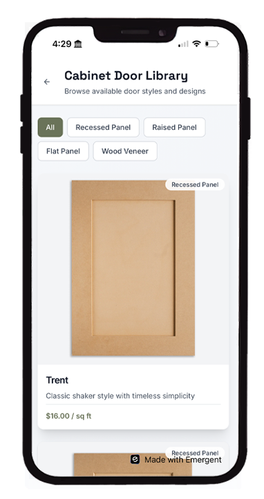 CabinetDoors.app includes a built-in Door Library that makes specifying cabinet doors fast, clear, and consistent.